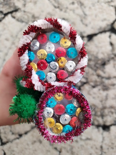 Wycinamy dwa kołeczka z foli przezroczystej, mogą być takiej samej wielkości ważne żeby były podobnego rozmiaru co wyjście rolki po ręczniku papierowym. Na jednym z nich przyklejamy cekiny i wkładamy do środka rolki ,zabezpieczamy ,u mnie drucikiem i klejem na gorąco żeby nie wylatywało na zewnątrz. Drugie kolko wkładamy do środka, później składamy trochę tak jak by w trójkąt papier lustrzany.Z tym będzie ciut zabawy , trzeba właściwie dociąć żeby dopasować do średnicy rolki – metoda prób i błędów chyba najlepiej się sprawdzi. I w zasadzie to wszystko. Do użycia w domu i na zewnątrz 🙂