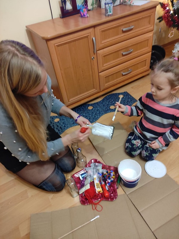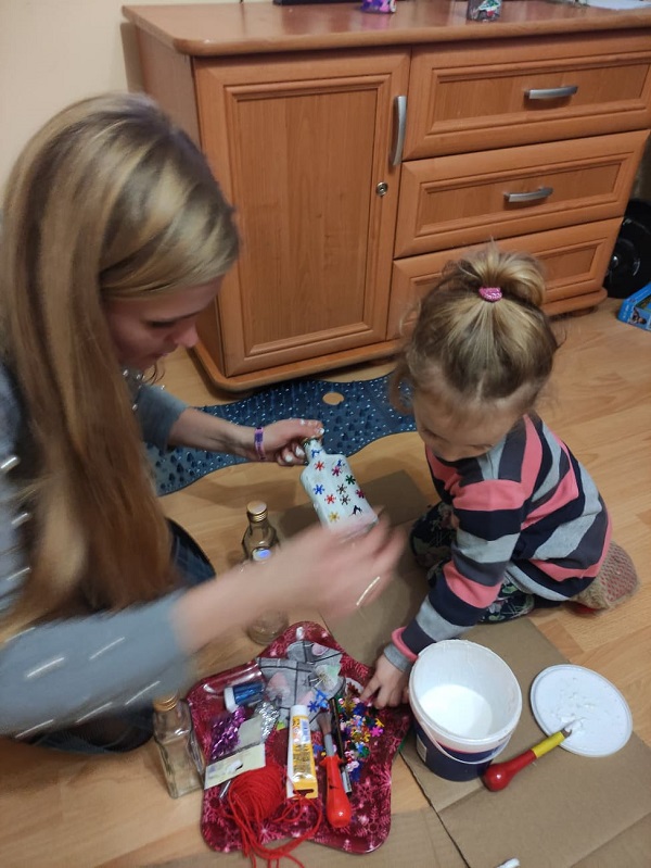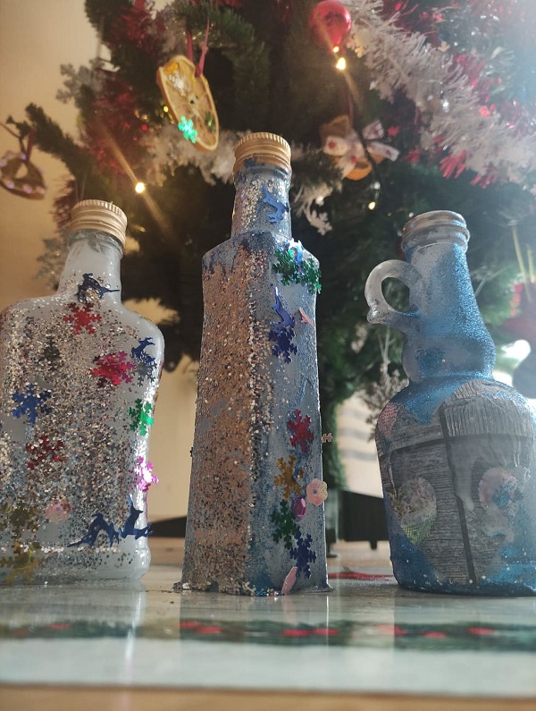 Robiliśmy tez jeden prezent dla dorosłych. Na podobnej zasadzie ,pomalowaliśmy ładne butelki zasypaliśmy brokatem i ozdobami, a o wkład zadbała mama i wlała do nich odpowiednie trunki.