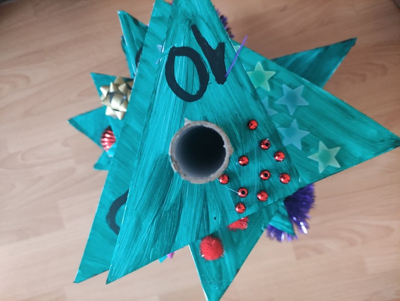 Trochę kartonu, farba, tekturowa rurka, która doczekała się w kocu w szafie „przyda się” .