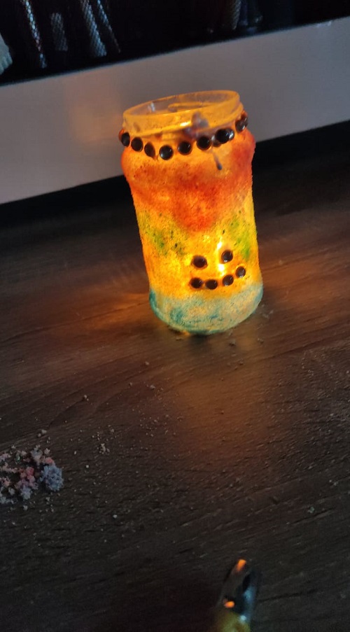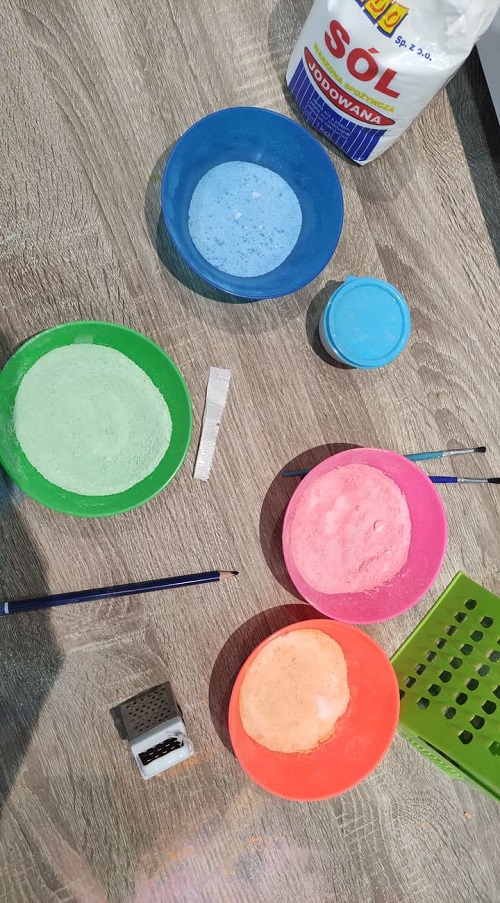 Zaczynamy od przygotowani kolorowej soli- wsypujemy do misek sól i ścieramy po kawałku kredy ,mieszamy i trzemy do uzyskania fajnego koloru. Później malujemy słoiki klejem i posypujemy, u nas warstwa po warstwie cały słoik.