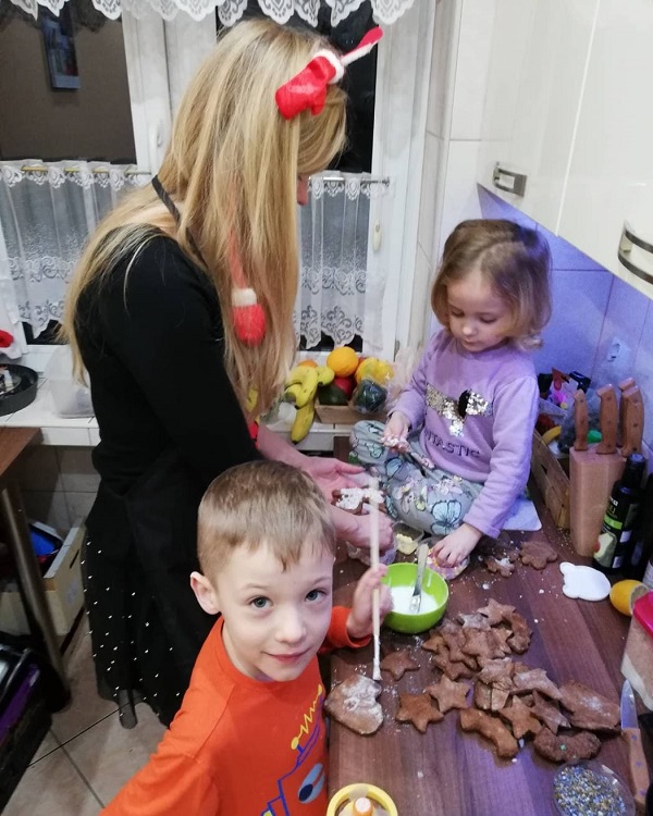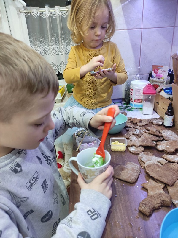 Robimy z przepisu bardziej staropolskiego, więc zaczynamy prace nad ciastem już w listopadzie, dzięki czemu atmosfera świąteczna unosi się już o wiele wcześniej w domu i skutecznie staram się ja utrzymywać. Zatrudniam swoje osobiste elfy do działania na każdym etapie- od wbijania jaj i mieszania składników, wyrabiania ciasta, wykrawania fantastycznych kształtów po zdobienie i oczywiście konsumpcję.
