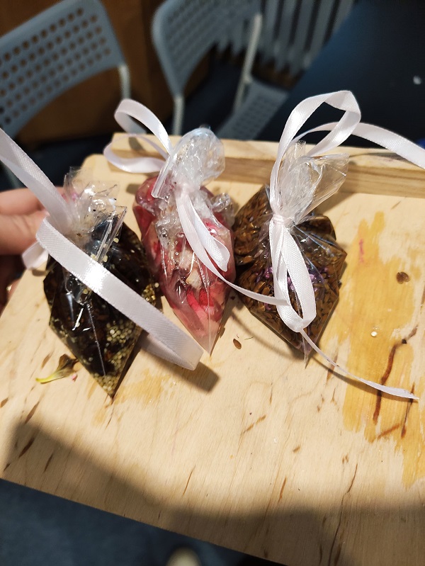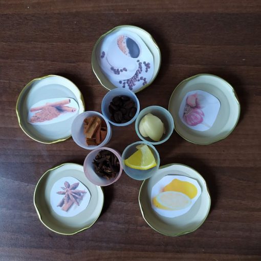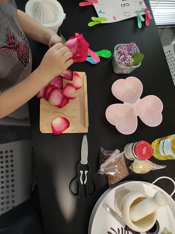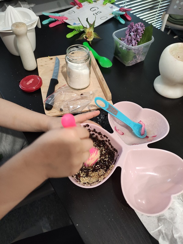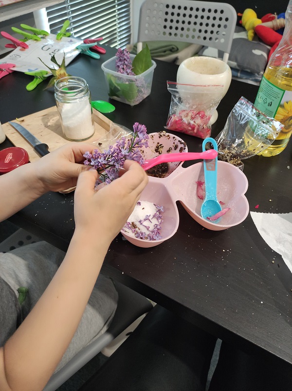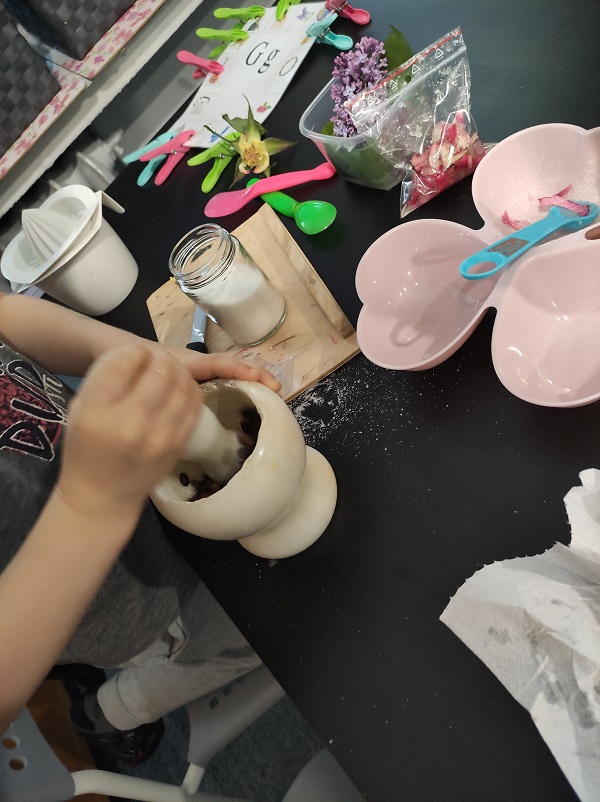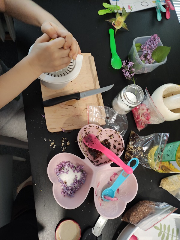 Kwiaty oddzielane ręcznie i ten zapach… Użycie samodzielnie wyciskarki czy moździerza daje niesamowitą satysfakcje dzieciom. „ja sam, ja umiem !” Poczucie satysfakcji myślę, że dla wszystkich.
