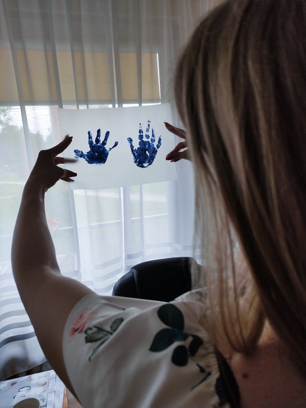 I tak jak na zdjęciach – odcisnęliśmy rączki, wycięłam lekko folię i do piernika, miedzy dwa arkusze papieru do pieczenia. Próbowaliśmy dwa razy, laminowanie przed pieczeniem nie poprawia efektu tylko rozmazuje odcisk wiec nie wychodzi na plus. Trwały odcisk na pamiątkę, mnie cieszy