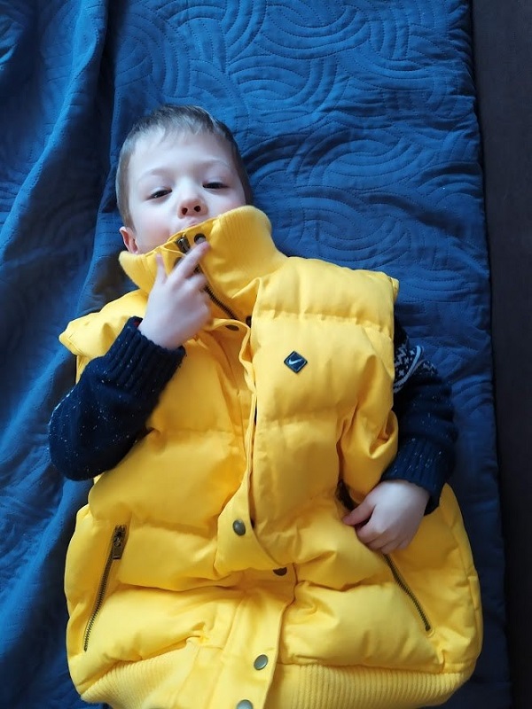 Marcin ma problem z przetwarzaniem bodźców – tych z zewnątrz jak i tych na zewnątrz. Ciężko jest mu się skupić, wiele rzeczy go rozprasza -takich na które my nie zwracamy uwagi, dla nas to może być to jakiś szum w tle. Kamizelka wpływa na jego układ nerwowy pomagając modulować przyjmowanie i przetwarzanie tych bodźców przez co poprawia się jego koncentracja oraz jakość jego funkcjonowania czy w domu czy na zajęciach. Nie próbowaliśmy wprawdzie stosować kamizelki w przedszkolu, ale w domu ćwiczy często ze mną będąc w niej (ćwicząc mam na myśli prace stolikową) lub po prostu leży zawsze gdzieś na wierzchu i gdy czuje potrzebę to ją wkłada. Gdy nie ma takiej możliwości często szuka innych rozwiązań -szuka najcięższej kurtki, torebki czy kamizelki jaka znajdzie z dorosłego i też wkłada.