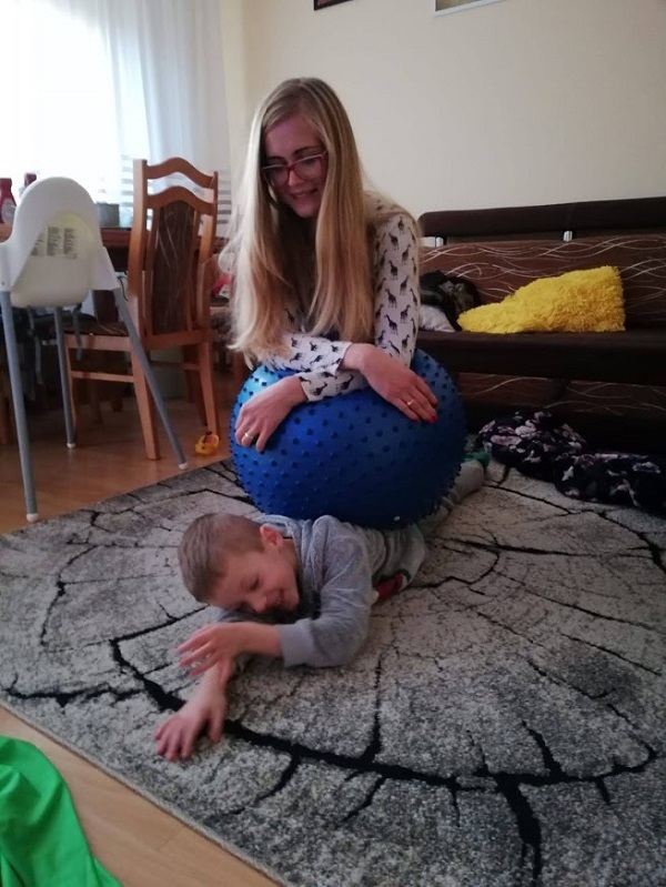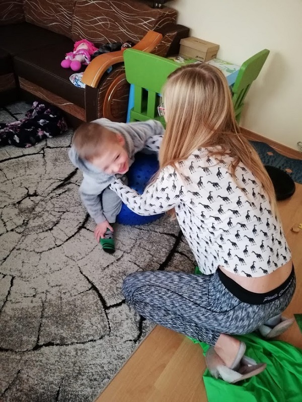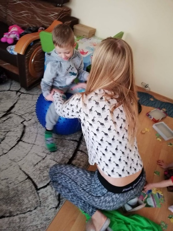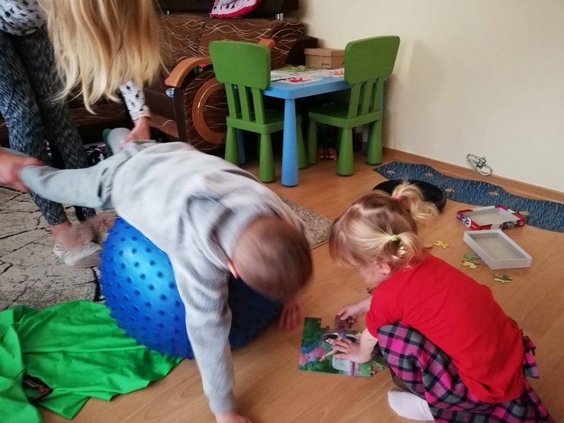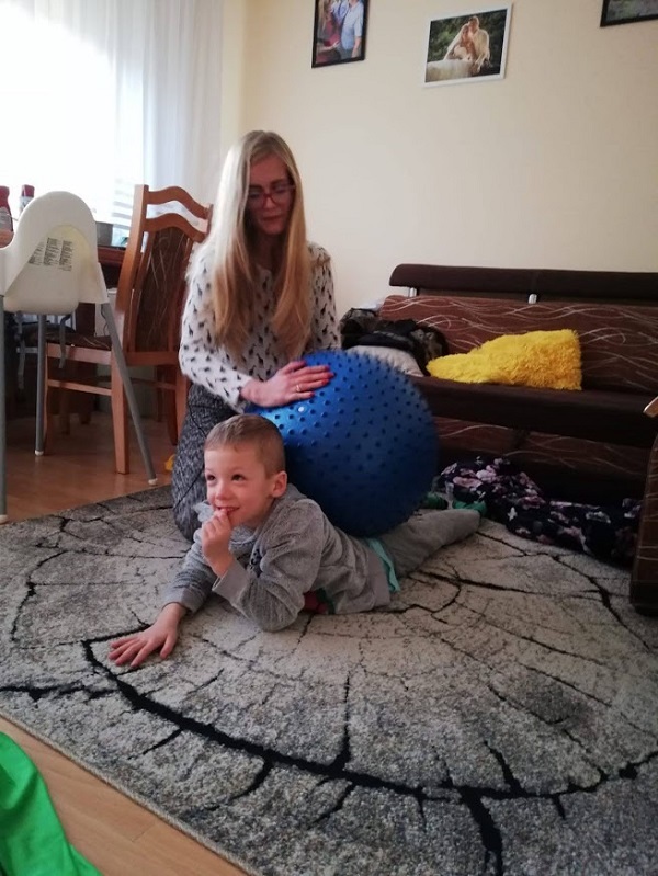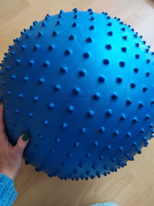 Można było oczywiście kupić gładką, ale myślę że ta bardziej wpasowała się w gusta Marcina. Sprawdza się przede wszystkim w masażach dociskających. Często żeby pomóc Marcinowi się wyciszyć, proszę go żeby położył się na podłodze. On już sam wie o co chodzi i kładzie się sam jak chce albo na plecach ale zdecydowanie częściej na brzuchu. I dociskam go piłką dość mocno, jeżdżąc w różnych kierunkach piłka po jego ciele. Poza tym służy do wyskakiwania się, czy do zabawy ukierunkowanej w ćwiczeniu mięśni .Różnych mięśni .Często siada na piłce a ja próbuje go z niej zrzucić, oczywiście w formie zabawy trzymając go za biodra przez co musi angażować mięśnie brzucha, które mamy niestety dość słabe. Często też kładzie się na brzuchu – tak jak to widać na zdjęciu, trzymam go za nogi i np daje zadanie aby układał wieże z klocków czy próbował ułożyć najprostsze puzzle. Wypustki mogą służyć też nam, podobno mają właściwości antycellulitowe, stymulują receptory podskórne, rozgrzewają i w ogóle… Obiecuję sobie że będę na niej oglądać tv wieczorem ale jakoś nie wychodzi. A to świetne ćwiczenia na mięśnie stabilizacyjne całego ciała także dla nas. Polecam spróbować