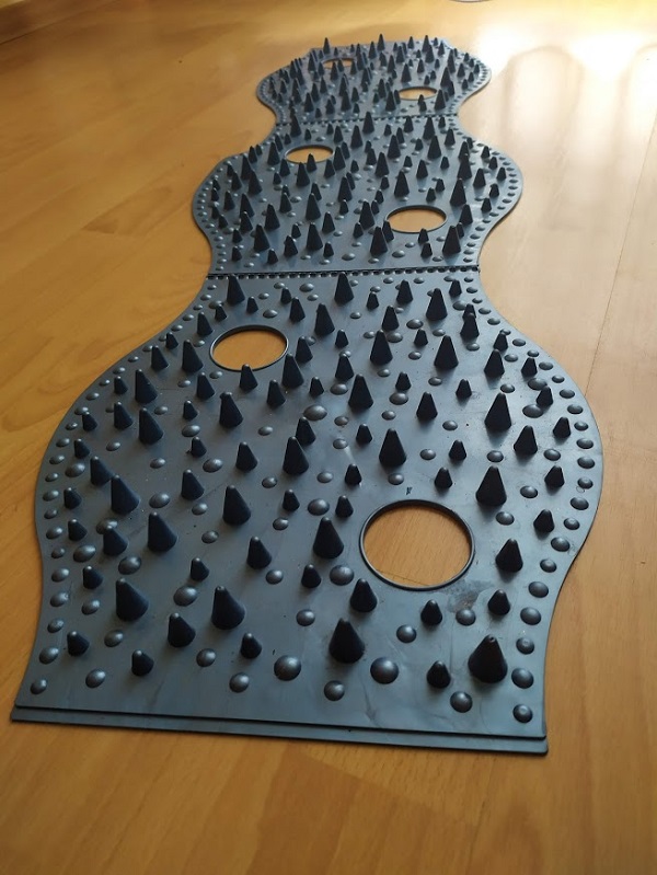 Może posłużyć za swoje rodzaju ścieżkę sensoryczną. Spacer po niej stymuluje mięśnie krótkie stopy. Staramy się żeby w te puste kółka dziecko wkładało swoja pietę, a resztą stopy stawało na kolczastą matę, podobno wtedy masaż jest najbardziej stymulujący. Marcin tez chętnie się po tym turla, ale nie każdy lubi tego rodzaju stymulację. Kalinka miała kiedyś problem z trzymaniem dystansu od tv – najchętniej by w niego weszła. Dlatego postawiliśmy ścieżkę przed komoda i tv co stanowiło pewnego rodzaju zasieki 😀 Jakoś nie koniecznie chciała na tym stać. Już się odwrażliwiła na tyle że nie stanowi to dla niej problemu czy wyzwania… wiec musimy wymyśleć nowa przeszkodę 🙂