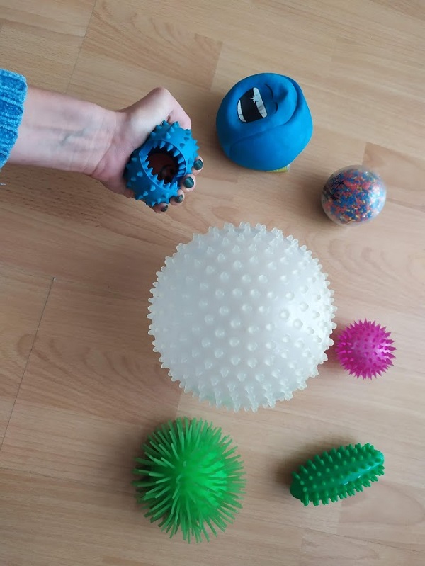 No i pozostały wszelkiego rodzaju piłki i piłeczki o różnych kształtach i rozmiarach służące do masażu dłoni i całego ciała. No i oczywiście do rzucania. Marcin ma jeszcze spory problem z tą umiejętnością, niby prostą a jednak jak się okazuje nie dla wszystkich. No i oczywiście łapanie to dla niego już wyższa szkoła jazdy. Ta średnich rozmiarów jasna piłka dodatkowo gdy zostawimy ją wystawioną wystarczająco długo na działanie światła to później świeci w ciemności więc jest dodatkowe wooow.