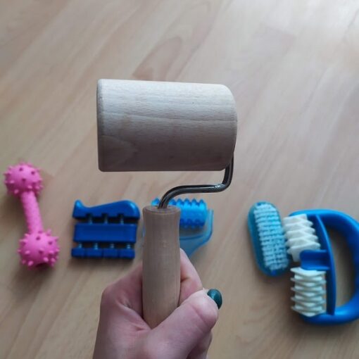 Można było oczywiście kupić gładką, ale myślę że ta bardziej wpasowała się w gusta Marcina. Sprawdza się przede wszystkim w masażach dociskających. Często żeby pomóc Marcinowi się wyciszyć, proszę go żeby położył się na podłodze. On już sam wie o co chodzi i kładzie się sam jak chce albo na plecach ale zdecydowanie częściej na brzuchu. I dociskam go piłką dość mocno, jeżdżąc w różnych kierunkach piłka po jego ciele. Poza tym służy do wyskakiwania się, czy do zabawy ukierunkowanej w ćwiczeniu mięśni .Różnych mięśni .Często siada na piłce a ja próbuje go z niej zrzucić, oczywiście w formie zabawy trzymając go za biodra przez co musi angażować mięśnie brzucha, które mamy niestety dość słabe. Często też kładzie się na brzuchu – tak jak to widać na zdjęciu, trzymam go za nogi i np daje zadanie aby układał wieże z klocków czy próbował ułożyć najprostsze puzzle. Wypustki mogą służyć też nam, podobno mają właściwości antycellulitowe, stymulują receptory podskórne, rozgrzewają i w ogóle… Obiecuję sobie że będę na niej oglądać tv wieczorem ale jakoś nie wychodzi. A to świetne ćwiczenia na mięśnie stabilizacyjne całego ciała także dla nas. Polecam spróbować