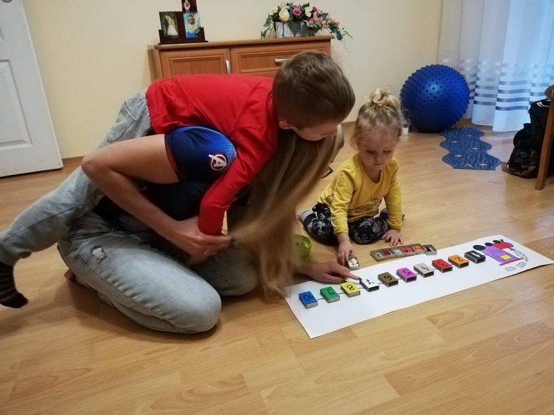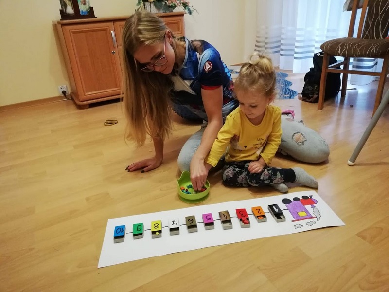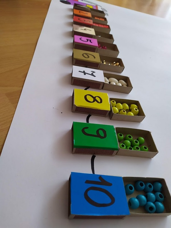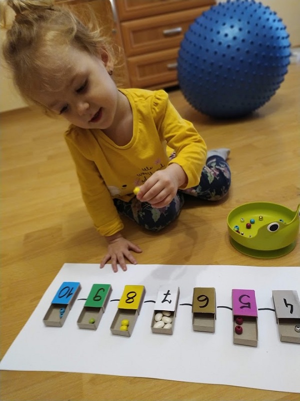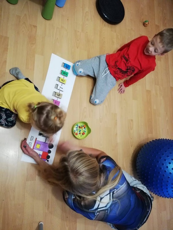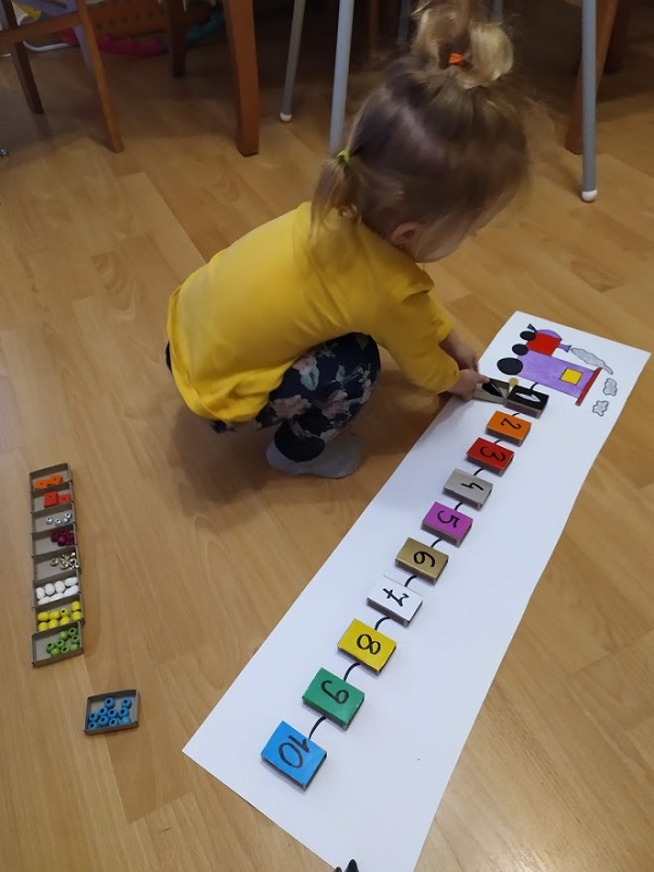 Pociąg narysowany(I’m so proud of myself :D) a wagoniki zrobione z pustego tuzina opakowania po zapałkach. I odpowiednio jak na zdjęciu do cyfry przypisany jest kolor i różnego rodzaju koraliki. Kalinie wyjątkowo mocno się podobało i przerabiała zabawę na różne swoje sposoby, ale mój cel osiągnięty ułożyła za którymś razem jak trzeba o 1 do 10 i właściwie kolorami. Marcin nie miał humoru niestety ostatnio przychodzi z przedszkola jakiś niedostymulowany i dosłownie lata po ścianach, wszystkich ściska zdecydowanie za mocno itp… W następnym poście opiszę wam po co i na co to wszystkie kolczaste piłki, maty inne rzeczy które wpisały się na stałe w wystrój naszego salonu i całego domu. To nasz pożyteczny bałagan, pewnych rzeczy choćbym miała zapowiedzianą wizytację króla Artura czy Aqamen zdecydował się wpaść na herbatę to bym nie sprzątnęła. A w sumie może któryś z nich z pożytkiem by z naszych zabawek skorzystał? 🙂