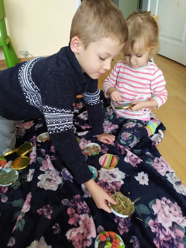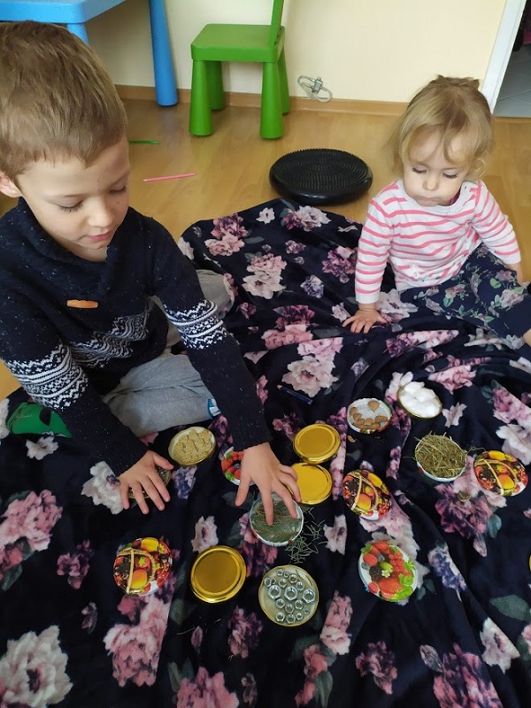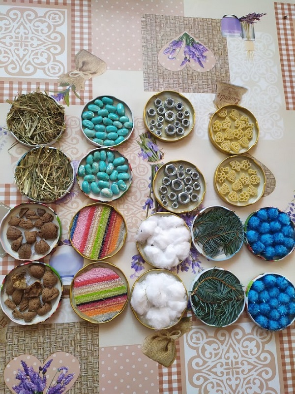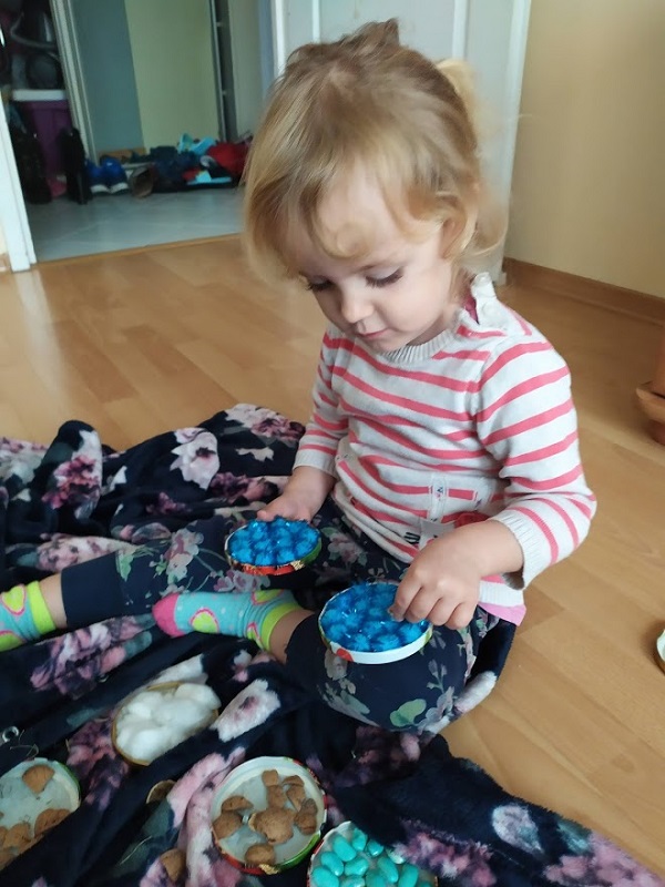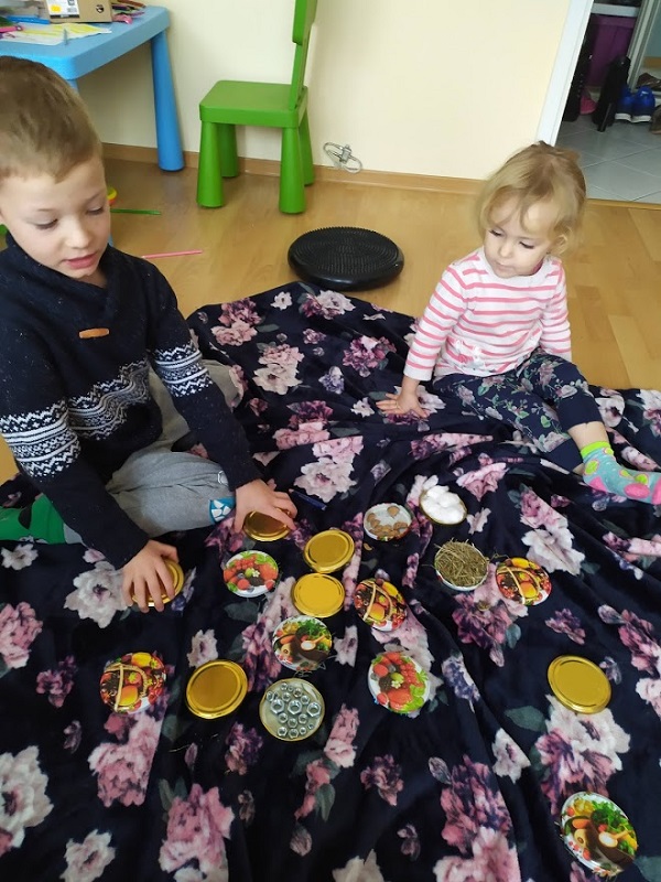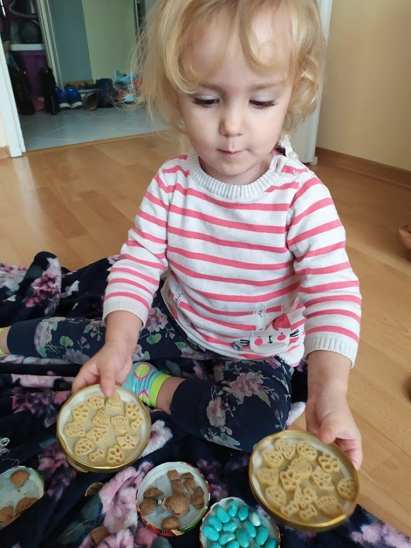 Potrzebujemy nakrętki do słoików, pistolet z klejem i różne różności które mamy w domu albo które na szybkości możemy zebrać z dworu u nas przykładowo :nakrętki ze śrub, siano, wata, skorupy z orzecha, fasola (u nas niebieska bo taka nam została po poprzedniej zabawie) ostra część gąbki do mycia naczyń, pompony z zestawów kreatywnych no i makaron ze słynnym psim patrolem. Wszystko kleimy razy dwa, odwracamy i dziecko odkrywa po jednym, stara się znaleźć dwa takie same. Zasady i poziom trudności ustawiamy pod umiejętności naszych dzieci