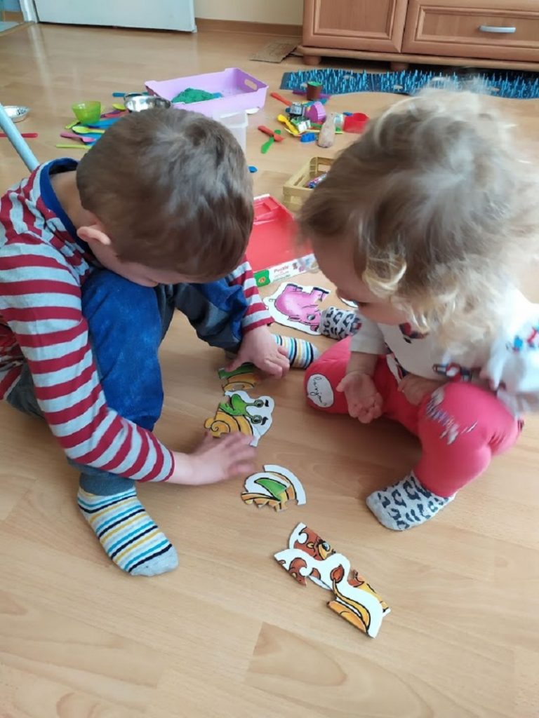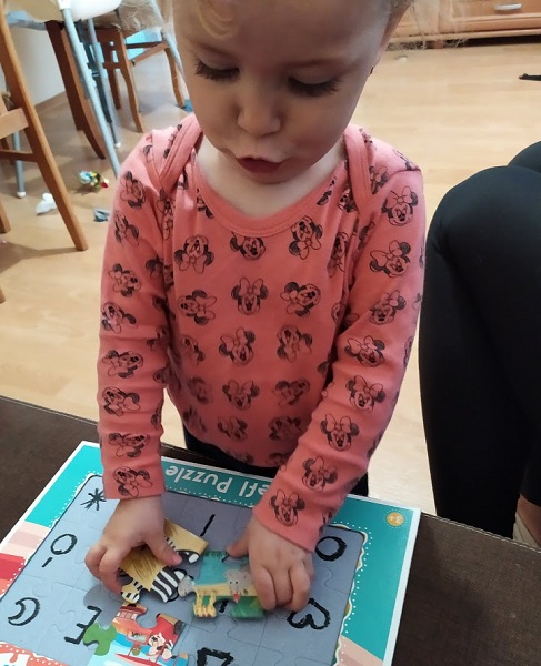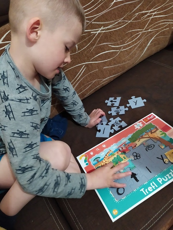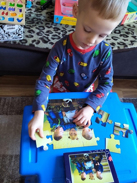 Nic ostatnio nie dodajemy bo sporo rzeczy nam nie wchodzi, mnie opuściła też wena i skupiamy się na grach, książkach i puzzlach które mamy. Jutro już dzień dziecka więc do kolekcji pewnie przybędzie nam wszystkim zabawek, potrzebnych i mniej potrzebnych. Ja kupując coś w prezencie staram się żeby to było coś co czasem nawet zmusi rodzica do spędzenia czasu z dzieckiem (taka że mnie wredna małpa) bo uważam że to najlepsze co możemy im dać. Swoją uwagę i czas. U nas na topie ostatnio puzzle, szczególnie u Kalinki a Marcin na szczęście coraz częściej w ramach – a dokuczę jej i ułożę za nią – więc pochwalimy się naszymi pomysłami jak zachęcić do współpracy. Układanie puzzli sprzyja rozwojowi to chyba oczywiste, wspiera motorykę budujemy wspólne pole uwagi i takie tam. Ale nie każdy je lubi, np żeby Marcinka zachęcić do tego aby spojrzał w ich stronę to powiem szczerze był wyczyn. Na szczęście da się w tej chwili zrobić puzzle ze zdjęć stąd nasze pierwsze z jego zdjęciem(EMPIK), później doszły zdjęcia z nami no i upragniona pralka. Przy puzzlach ramowych żeby zachęcić i było niby łatwiej z tyłu każdego puzzla pisałam literki, sylaby, wzory, albo kolory które pasowały do miejsca w którym miały być w ramce. Niby łatwiej, a w sumie nie zawsze. Dziecko ma niby podpowiedź bo musi dobrać takie same żeby pasowało, a przy okazji powstaje upragniony obrazek. Na dole przykład naszych ostatnich. Gdy działaliśmy z metodą krakowską dodawałam też paradygmaty. U nas się sprawdziło może i u was się uda zachęcić lub odświeżyć stare żeby były atrakcyjniejsze bo z reguły dla dzieci wszystko co nowsze jest fajniejsze, przynajmniej na chwile. Można też stworzyć własne puzzle na wiele sposobów: od cięcia pocztówek czy jakiś tekturek czy na dwa, cztery czy więcej elementów lub tak jak my -poniżej. Do wykonania takich puzzli potrzebne są:
