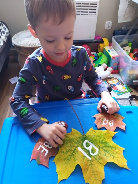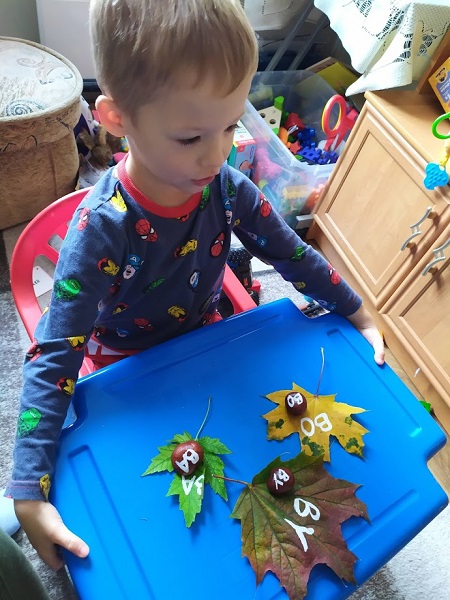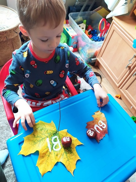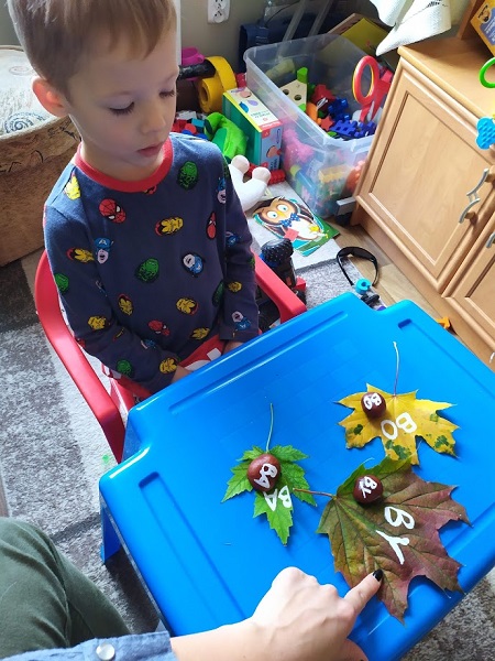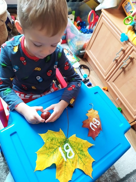 Jesiennych liści już nie znajdziecie ale chcielibyśmy się pochwalić naszym sposobem na utrwalanie paradygmatów który akurat spasował Marcinkowi. Na spacerze zebraliśmy liście i kasztany (no dobra przyznaje liście ja zebrałam i walczyłam żeby je wnieść do domu bo Marcin uznał to za śmieci więc po co) .Korektorem wypisałam paradygmaty tak żeby można było dobierać je w pary. Tyle wystarczyło żeby praca była milsza i ciekawsze dla obojga przez jakiś czas.