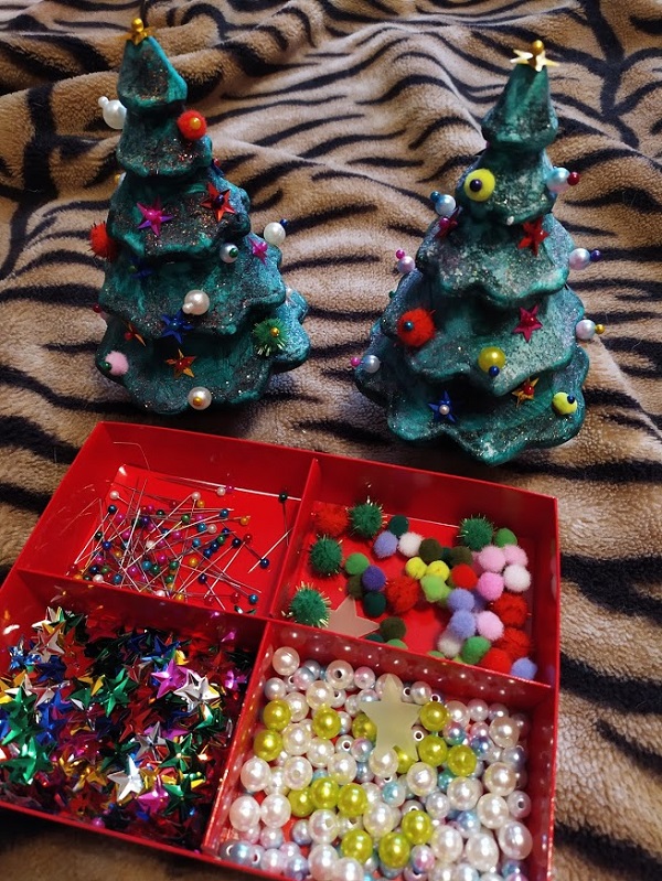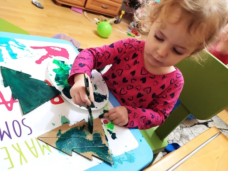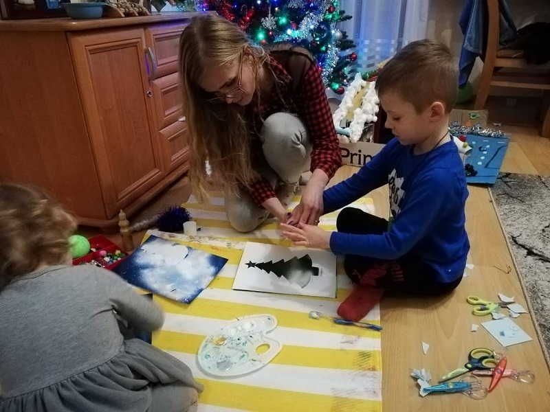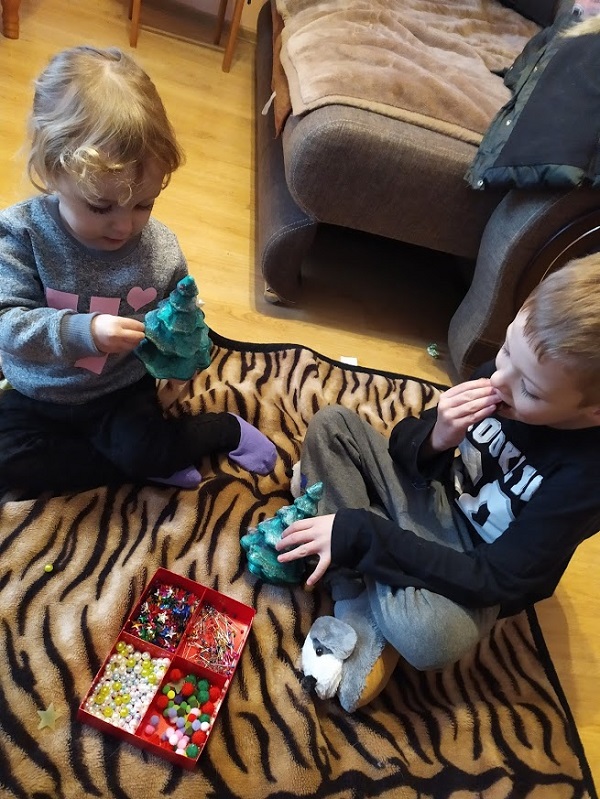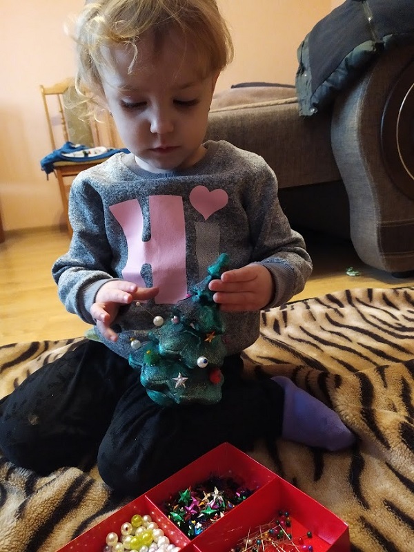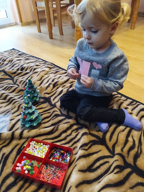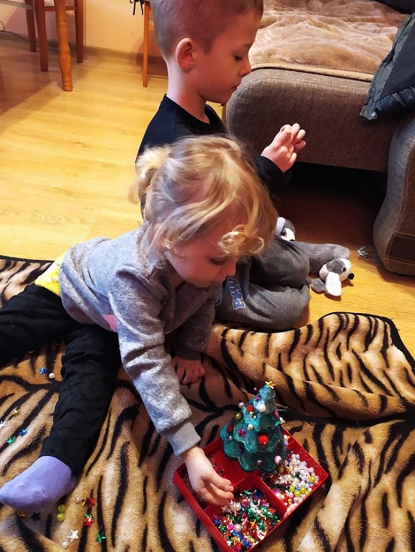 Choinki całkiem fajnie się prezentują. Są ze styropianu -takich dekoracji teraz w bród nawet i w marketach ,nie trzeba ich szczególnie szukać .Robiliśmy też bombki na tej samej zasadzie. Obojgu sprawiło radość malowanie w takiej formie powiedzmy innej bo nie na płasko na papierze ,czekanie aż wyschnie no i dalsza zabawa- szpilki-niby ostre ale zarówno male rączki Kalinki dawały sobie świetnie rade,była bardzo ostrożna i skupiona jak i Marcin.Pracował również ochoczo z tą różnicą że patrzyłam na niego przez palce. To ninja serio.Patrząc w sufit czy gdziekolwiek indziej ,nie na szpike czy ozdobę którą chce przymocować i jakoś trafia. Ukryta supermoc 🙂