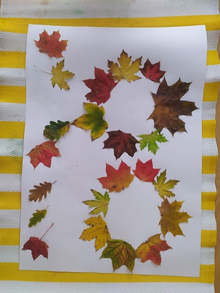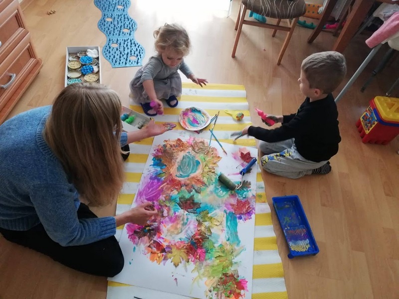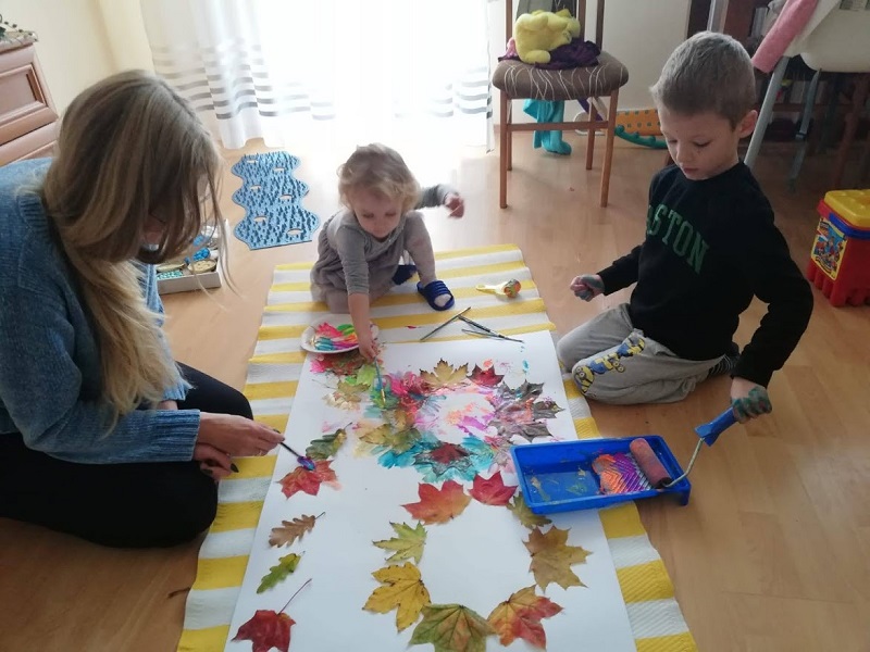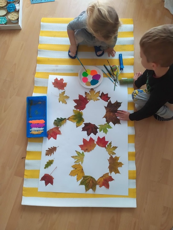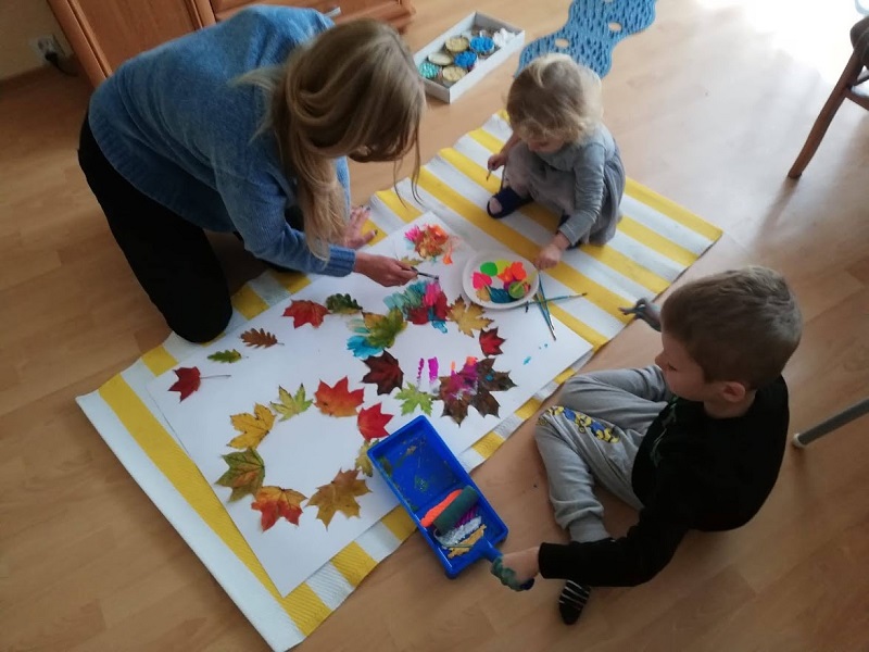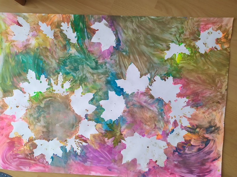 Swój własny obraz-malowanie oczywiście wszystkim czym nam odpowiada w naszym przypadku ręce i stopy tez wchodzą w grę ale każdy jak lubi. Na brystol przykleiłam liście, pomalowaliśmy cala powierzchnie i gdy farby wyschły oderwaliśmy od kartki.