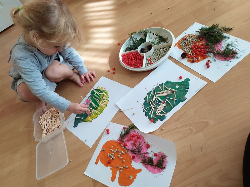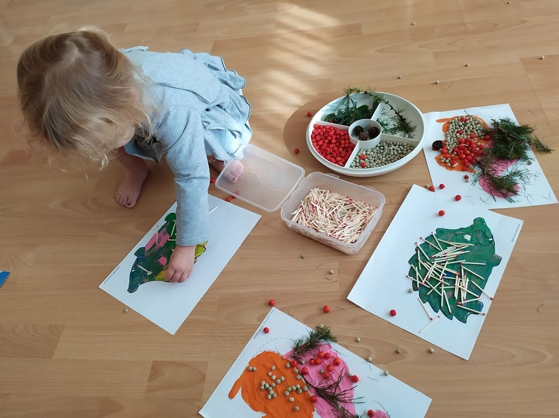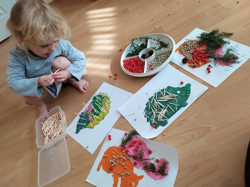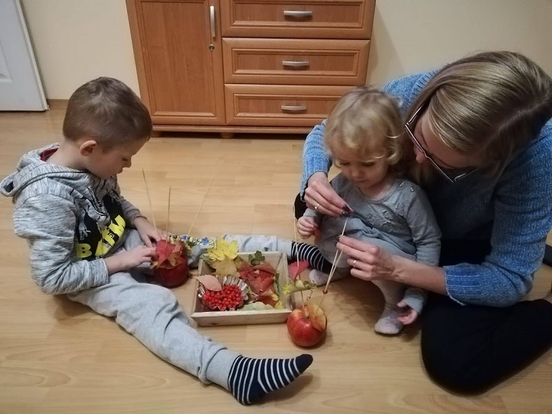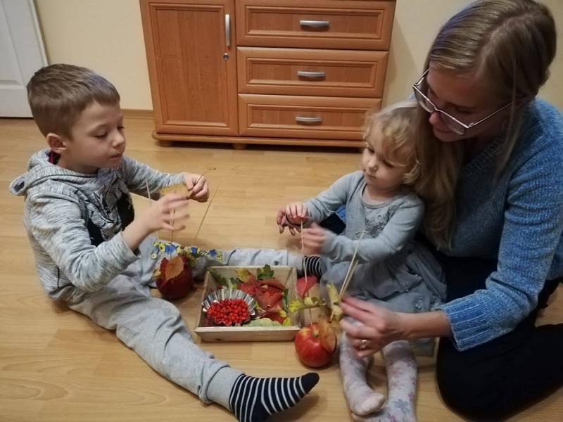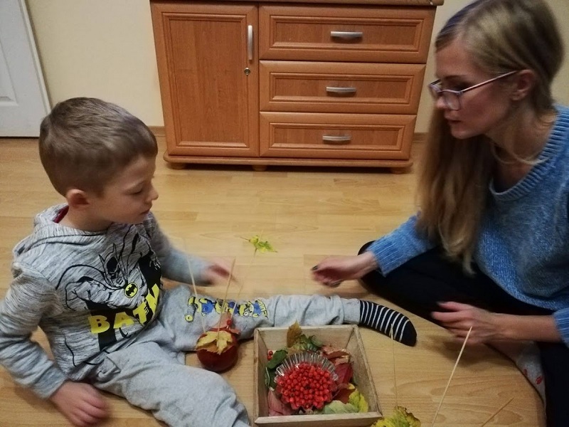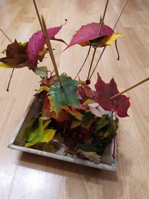 I to tyle, wkładamy na patyczki nasze liście i w sumie wychodzi niezły stroik a przy okazji ćwiczymy motorykę, koncentracje itp