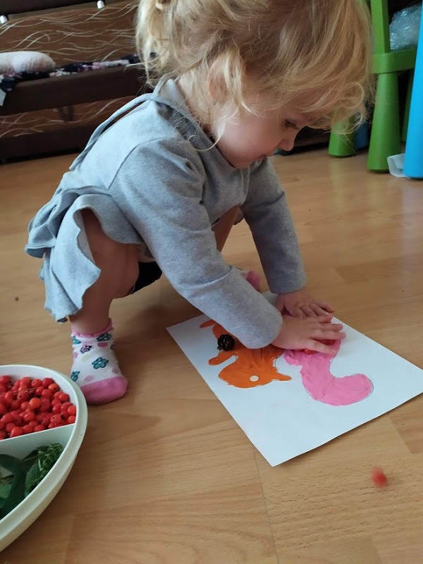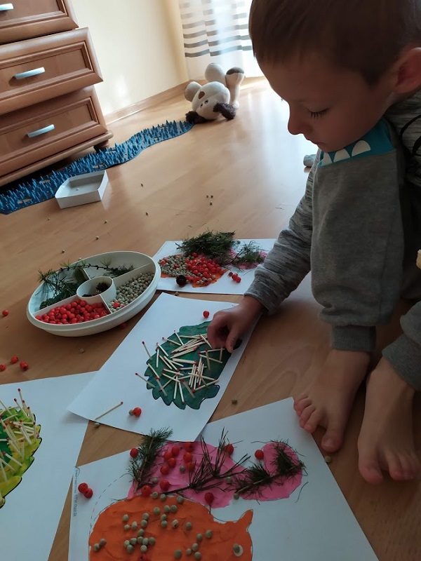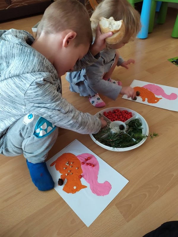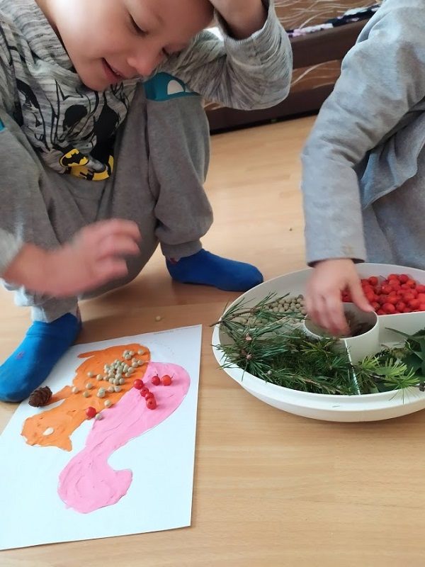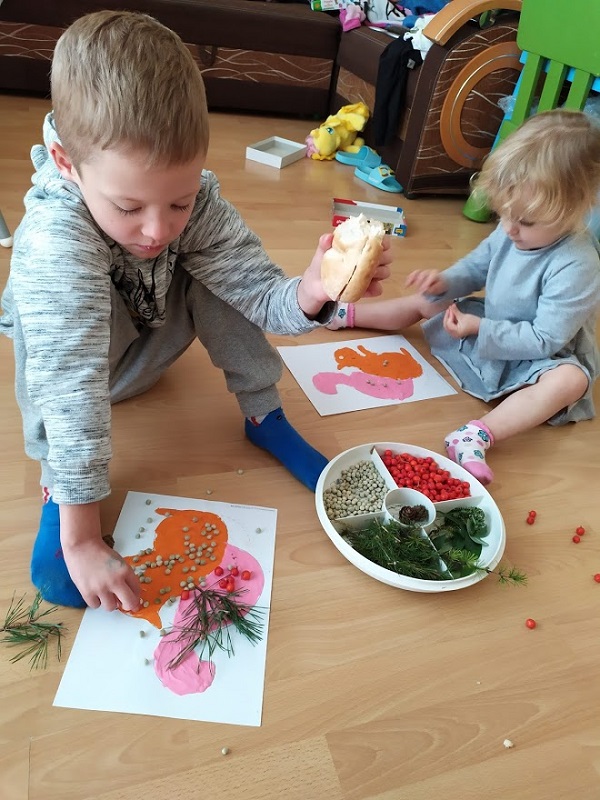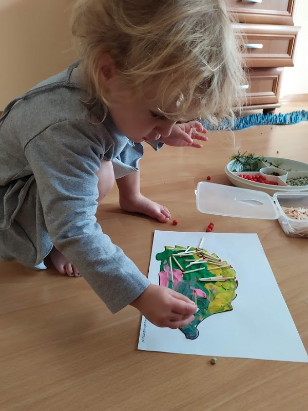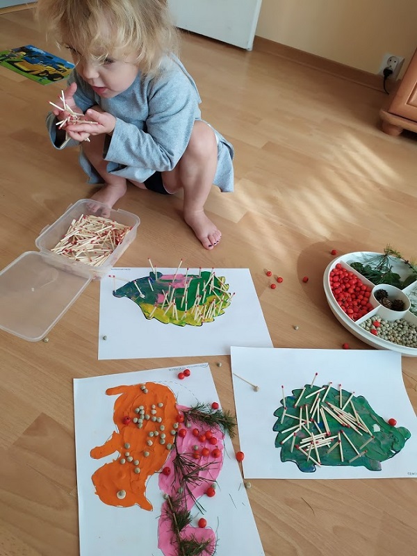 Wydrukowałam(bo tym razem nie chciało mi się strasznie udawać ze umiem rysować) rysunki jeża i wiewiórki. Wykleiliśmy wnętrze dokładnie plasteliną ,oczywiście z moja pomocą bo to ciężka praca dla małych paluszków. Później dałam dzieciom trochę jesiennych skarbów czyli jarzębina, kawałki choinki, ziarna to co na załączanym obrazku plus zapałki które miały służyć za kolce jeża. I naprawdę mieli zajecie na długo. Oboje !