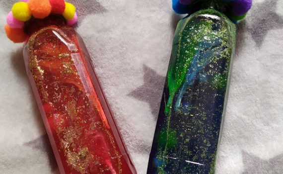 Dwie identyczne u nas plastikowe butelki, woda, klej z brokatem, brokat, barwnik, pompony, piórka… Czego dusza zechce My zrobiliśmy jedną w ciepłych odcieniach i podgrzaliśmy, drugą w zimnych i do zamrażalnika. Pobudzamy zmysły i próbujemy nazywać co ciepłe,a co zimne czyli nauka przez zabawę i doświadczanie-dzieci to kochają(przynajmniej moje)zabezpieczyłam klejem […]