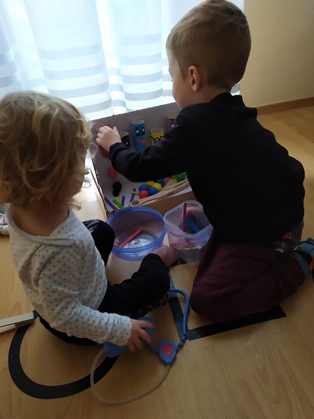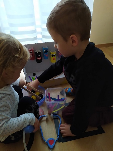 Poza zabawą ćwiczymy wiele umiejętności tj kategoryzacja, rozpoznawanie emocji (wałkujemy temat z Marcinem )ćwiczenie koordynacji ręka oko, ćwiczenie obręczy barkowej ,przekraczanie linii osi ciała czy ćwiczenie motoryki malej…U nas dochodzi jeszcze wspólna zabawa i próba dzielenia się materiałami tzw integracja domowa …Kalina jest za mała żeby szanować granice które stawia Marcin a Marcin zdarza się ze zwyczajnie przesadza. W skrócie wyrywanie bicie krzyki spazmy histerie…ale nie poddajemy się i próbujemy jakoś zbudować ich relacje .Zależy też jak kto się zabierze za to ćwiczenie tfuuu ZABAWĘ 🙂 Bo o to tu chodzi, dzieci maja nie wiedzieć ze się czegoś uczą wtedy mam wrażenie mimowolnie uczą się więcej. Zajęcie wydaje mi się dla rożnych grup wiekowych. Trzeba dać się pomylić ,chwalić gdy zrobi dobrze i w końcu się uda zrobić bezbłędnie. Miłego dnia dla wszystkich