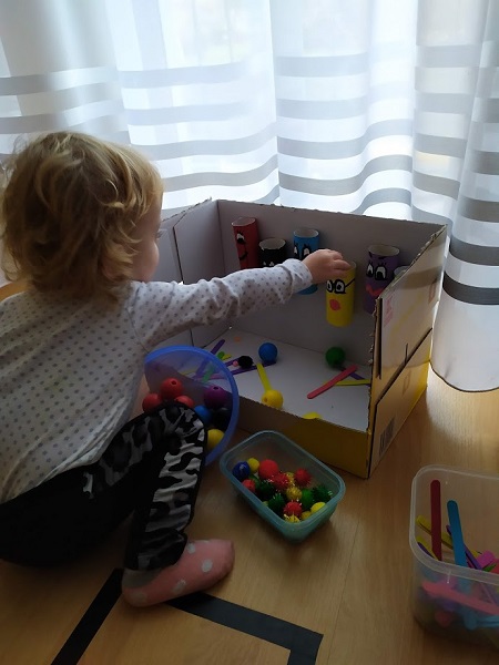 Kalinka jakiś czas temu przed snem przyłapała mnie na oglądaniu filmiku gdzie dzieciak sortował kolory tj wrzucał kolorowe piłki do rożnych tubek. Bardzo jej się podobało (do tego stopnia ze spać poszła dopiero za jakąś godzinę ) wiec stworzyłam coś podobnego